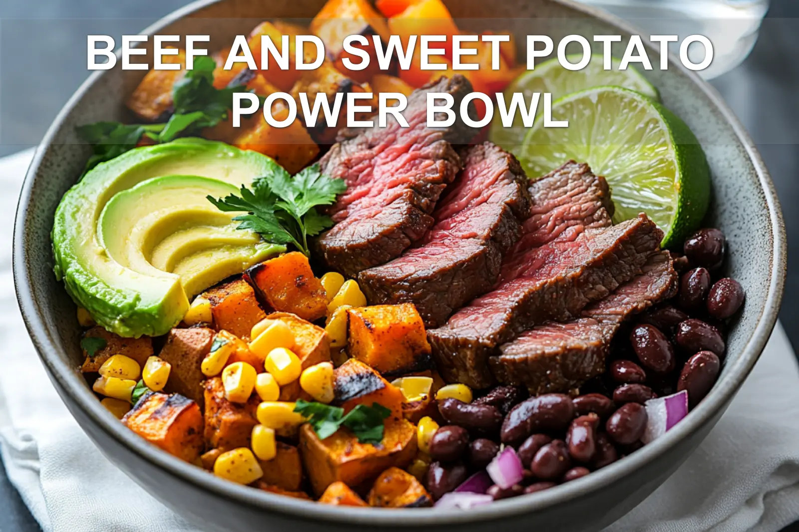 - Assemble the bowls: Start with a base (like rice, quinoa, or greens). Layer roasted sweet potatoes, beef slices, veggies, black beans, and corn. Top with avocado slices, chopped cilantro, and a final drizzle of lime juice.