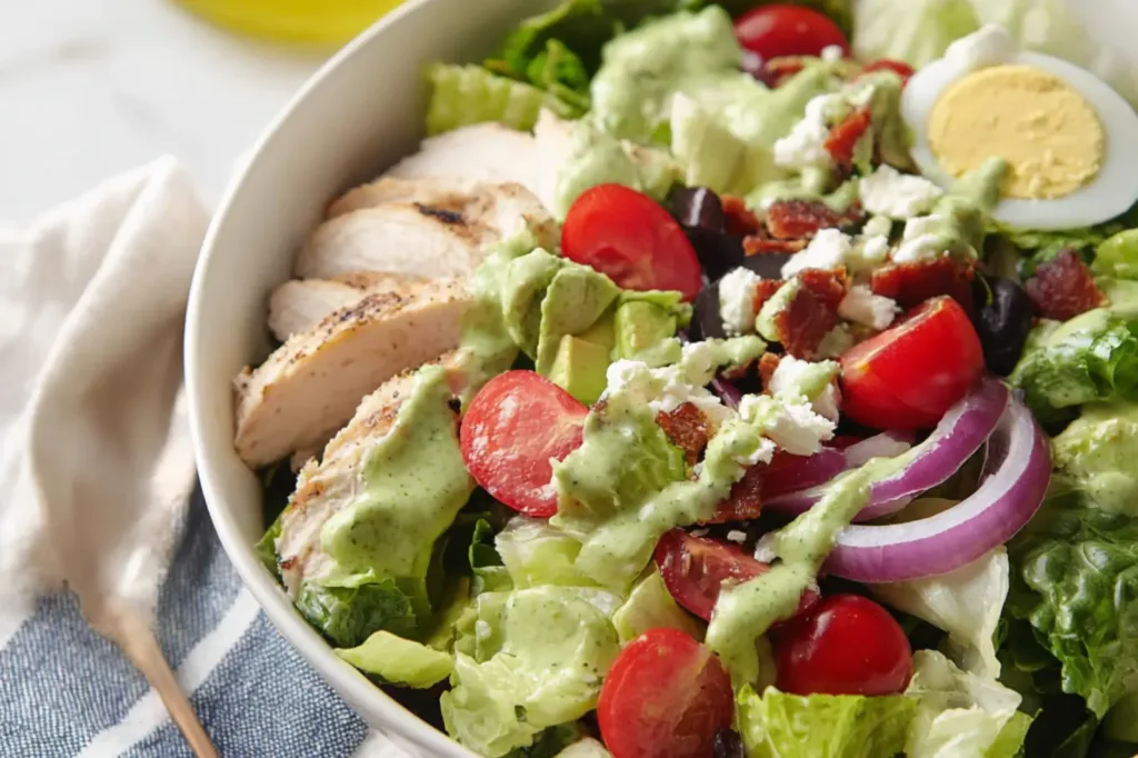 This recipe includes romaine, mixed greens, cherry tomatoes, hard boiled eggs, bacon, chicken breast, blue cheese, avocado, pickled red onions, and a creamy basil green goddess dressing.